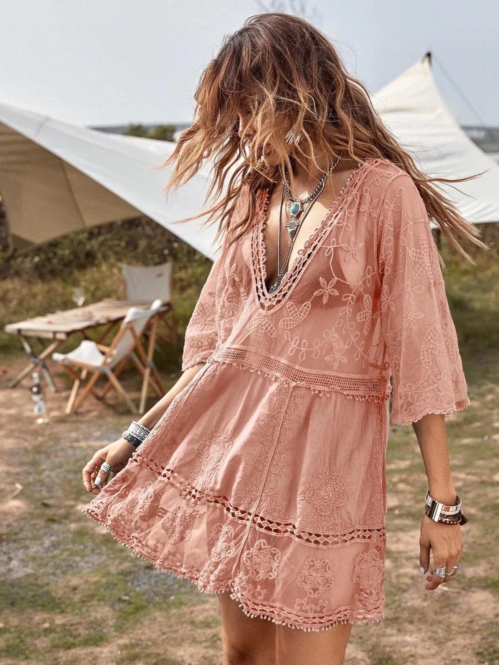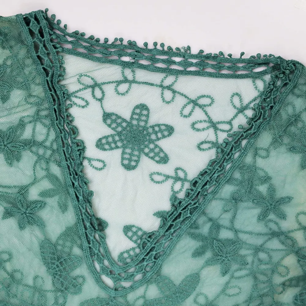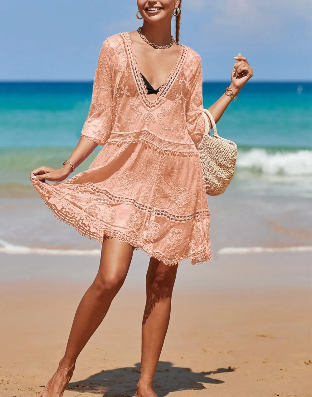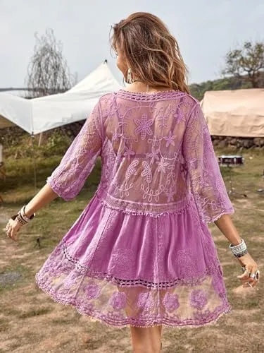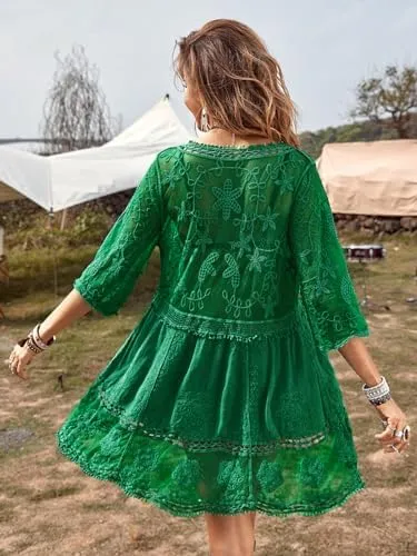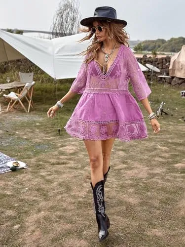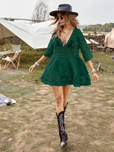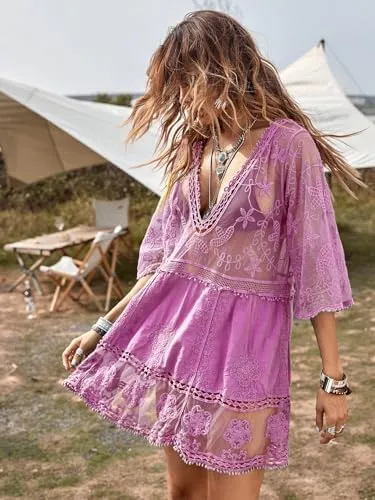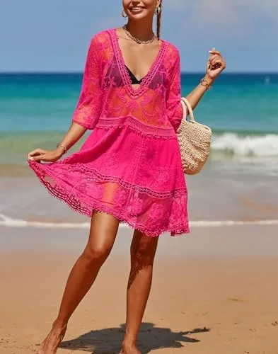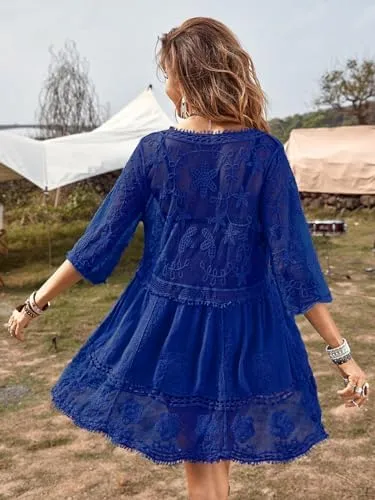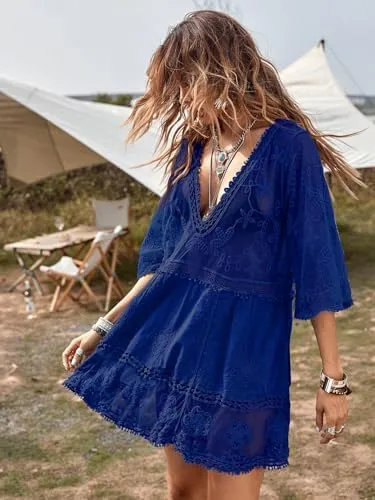 Women's Contrast Lace Bathing Suit Cover Up V-Neck Swimsuit Coverups Loose Swimwear Beach Dress Beachwear